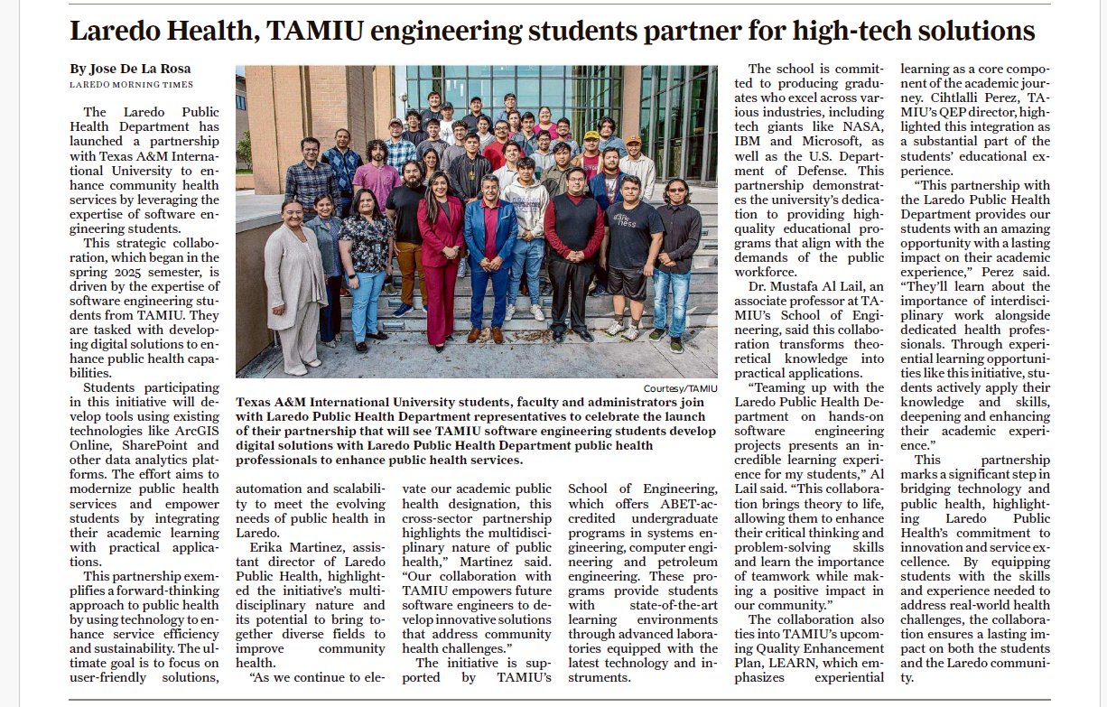 Read the press release about this service-learning course by clicking the following link: Laredo Public Health Partners with TAMIU Software Engineering Students to Enhance Community Services